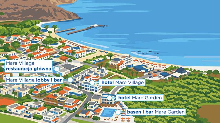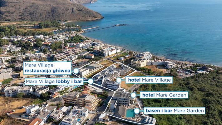 Hotel Mare Village położony jest na północno-zachodnim wybrzeżu Krety, w malowniczej miejscowości Georgioupolis, między Chanią a Rethymno. Obiekt znajduje się w spacerowej odległości od plaży, a w pobliżu dostępne są liczne tawerny i sklepy. To idealny wybór dla par szukających miejsca na relaks i pragnących odkrywać uroki wyspy.